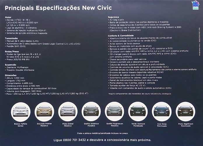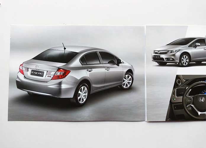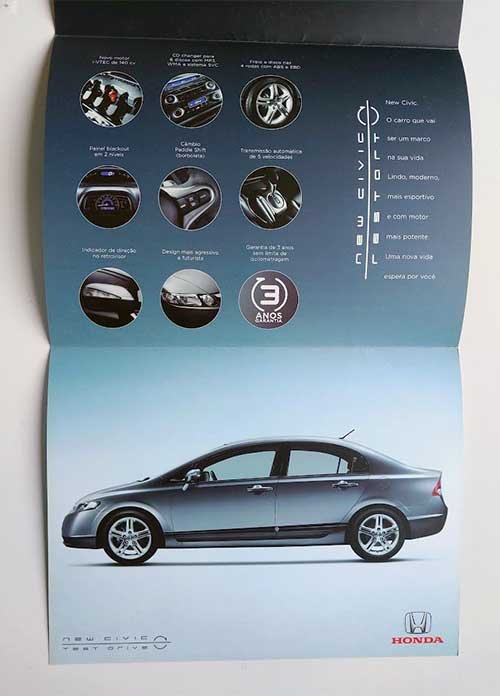 Os fãs do Honda Civic no Brasil encontram diversos catálogos à venda na Auto Livraria. Os prospectos originais abordam o sedã da marca japonesa em modelos 1999 (sexta geração), 2007 (oitava geração), 2014 (nona) e 2023 (décima primeira geração).