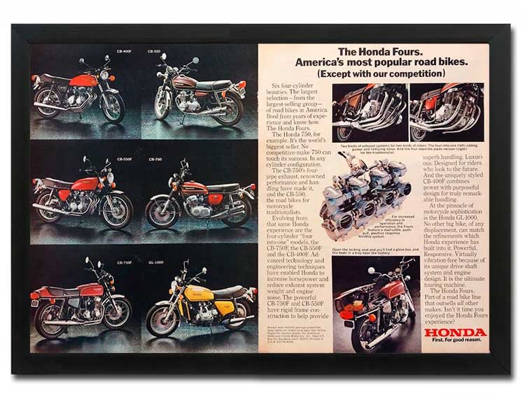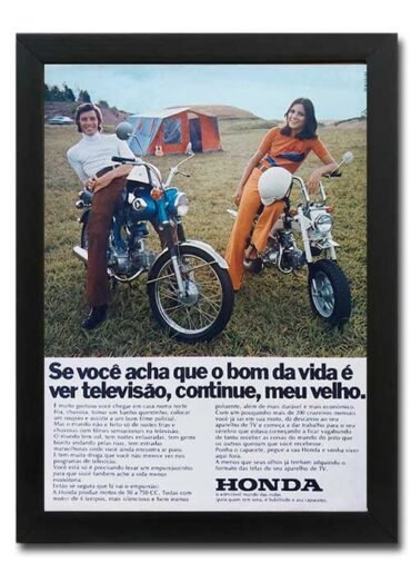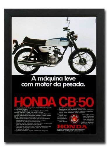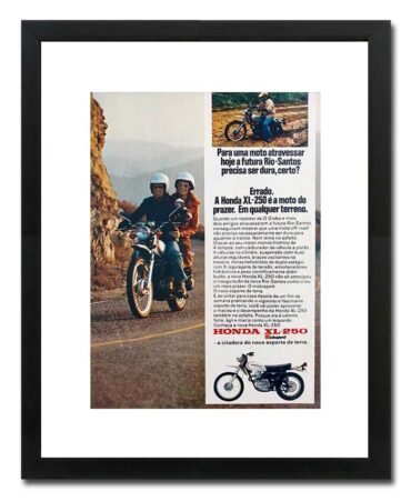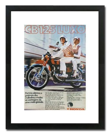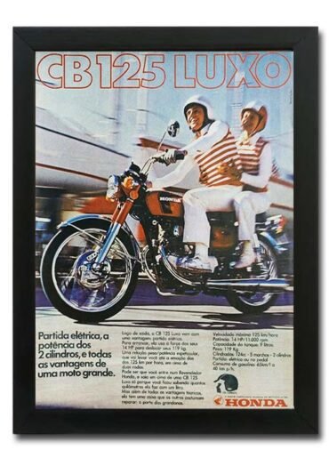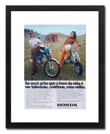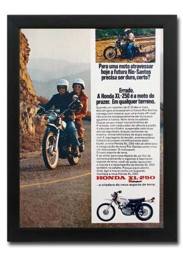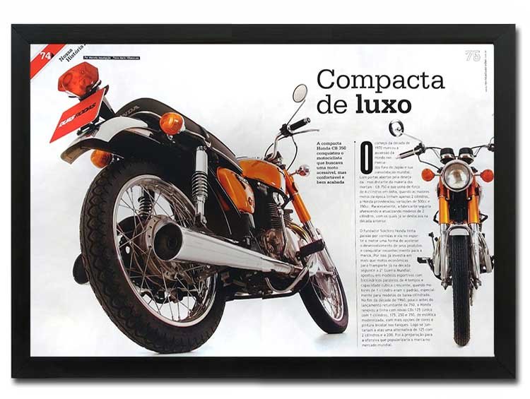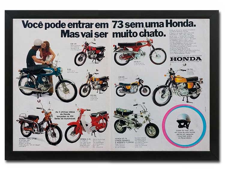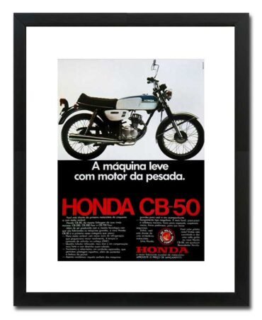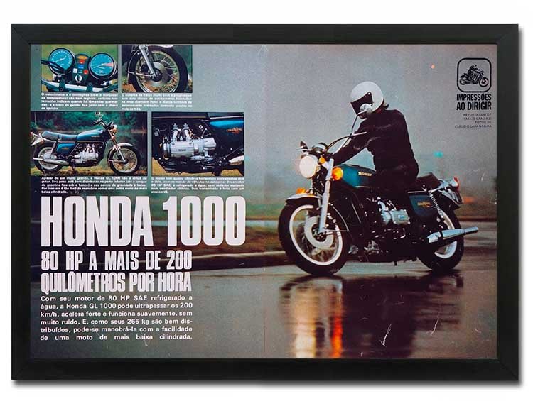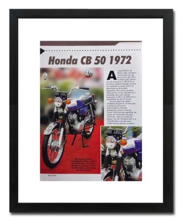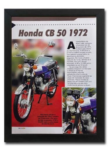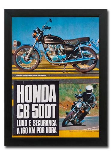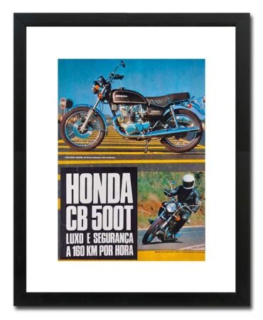 Essas e outras motos importadas daquele período estão nos quadros decorativos de produção própria da Auto Livraria Best Cars, com matérias e propagandas originais de época, sem reproduções. São ideais para decorar seu escritório ou garagem e para presentear quem também tem paixão pelas motos. Os quadros vêm completos com moldura de madeira de reflorestamento, proteção em acetato (plástico transparente) e gancho para pendurar. Sua oferta limitada garante uma exclusividade que não há nos quadros feitos em massa com imagens reproduzidas.