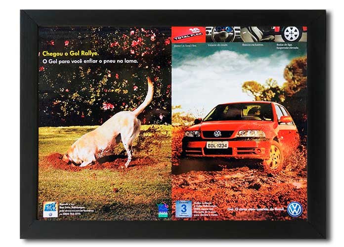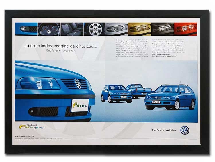 Os quadros, feitos com matérias e propagandas originais dos carros, sem reproduções, são perfeitos para decorar seu escritório ou garagem e para presentear. Vêm completos com moldura de madeira de reflorestamento, proteção em acetato (plástico transparente) e gancho para pendurar. Sua oferta limitada garante uma exclusividade que não há nos quadros feitos em massa com imagens reproduzidas.