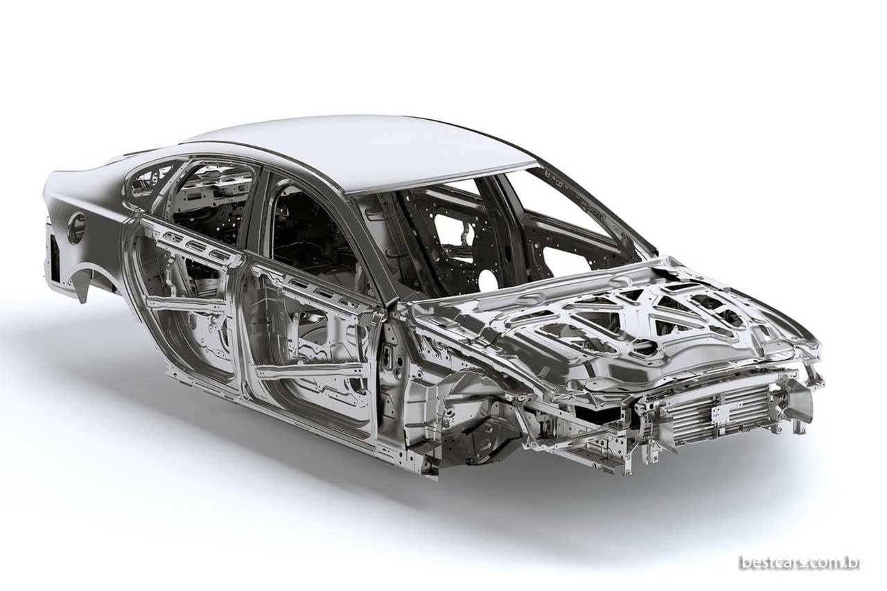 • A arquitetura básica é a mesma nos dois carros, com emprego de alumínio em mais de 75% da carroceria (na foto o XF). Como ocorre desde 2003 no sedã de topo XJ, rebites autoperfurantes e adesivos estruturais são usados em vez de pontos de solda, uma técnica da indústria aeronáutica. Ambos os modelos usam suspensão dianteira por braços sobrepostos, mais elaborada que a McPherson habitual em suas categorias, e traseira multibraço do tipo chamado de Integral Link, que segundo o fabricante oferece maior rigidez lateral e longitudinal, além de usar alumínio em vários componentes.