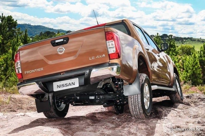 Novidade importante é a suspensão traseira com molas helicoidais em vez de feixes de molas semielípticas, solução única nas picapes desse porte no Brasil (leia quadro na página anterior). A mudança visa ao conforto e ao silêncio de rodagem, além de reduzir a sensação de que o veículo “flutua” em velocidade. No caso da Frontier não houve perda em capacidade de carga, 1.050 kg. A altura de rodagem, ampliada para o mercado brasileiro, permite vão livre mínimo do solo de 292 mm.