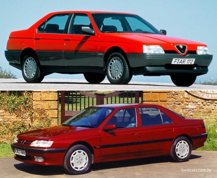 Olhe para o Alfa Romeo 164 (em cima), de 1987, e para o Peugeot 605 de dois anos depois. A semelhança de estilo é grande, tanto no conjunto quanto em detalhes como os vincos laterais. O Alfa foi criado pelo estúdio Pininfarina, que colaborou no desenho do Peugeot ao lado de estilistas da marca francesa.