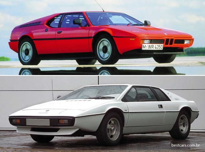 Outros esportivos dos anos 70 bem parecidos foram o primeiro Lotus Esprit (embaixo), de 1977, e o BMW M1, dois anos mais novo. Ambos foram desenhados pelo mesmo Giugiaro.
