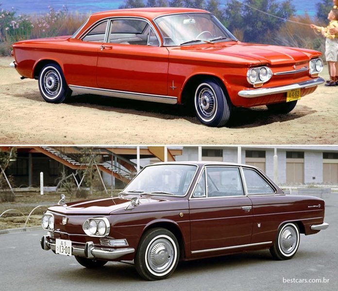 O Chevrolet Corvair (em cima) norte-americano, com motor traseiro, foi lançado em 1960. Quatro anos depois a japonesa Hino fez seu cupê Contessa, inspirada no carro da GM.