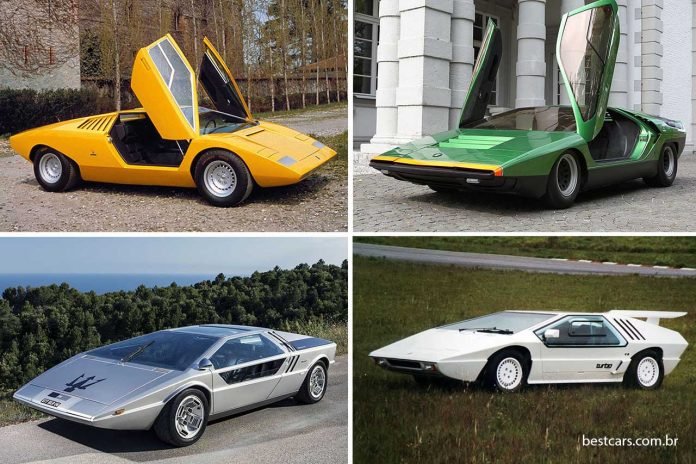 Qual desses é o Lamborghini Countach? O verde não é: aquele é o Alfa Romeo Carabo de 1968. Seria o prata? Também não: é o Maserati Boomerang de 1972. Esses carros-conceito foram desenhados por Marcello Gandini e Giorgetto Giugiaro, nesta ordem, com as mesmas ideias: perfil inspirado em uma flecha, linhas retas, para-brisa quase horizontal, motor central-traseiro. O Countach (em amarelo), outra obra de Gandini, apareceu em 1971 e chegou à produção três anos depois. Eles inspiraram um fora de série brasileiro, o Hofstetter (branco) dos anos 80.