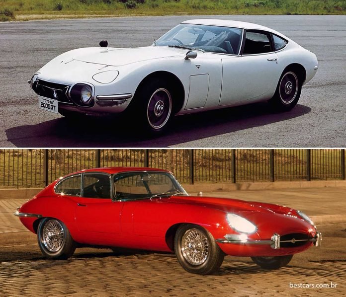 Na época, foi comum as fábricas japonesas imitarem desenhos ocidentais. O primeiro supercarro do país, o Toyota 2000 GT (em cima) de 1965, não nega a semelhança de linhas com o inglês Jaguar E-Type de quatro anos antes.