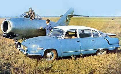 | O fato de a Tatra produzir também aviões não deixaria de ser explorado na publicidade do carro, que com 160 km/h de máxima era muito veloz para seu tempo |