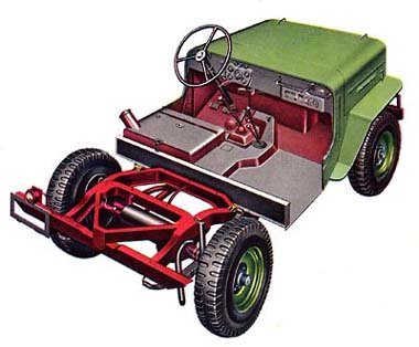 Nesta vista em corte, parte do chassi do Jeep, o interior rústico e a ótima solução do tanque de combustível sob o assento do motorista, protegido de pedras e obstáculos que atingissem a parte inferior |