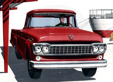 | Na linha 1957, uma alteração radical de estilo: a frente estava mais larga e retilínea, a caçamba perdia os pára-lamas salientes (o modelo 1958 da ilustração já trazia quatro faróis) |