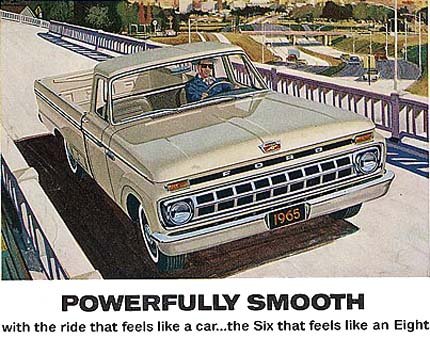 Ganhos importantes em conforto para 1965: a suspensão independente Twin-I-Beam, "com a rodagem que parece de um carro", e um motor de seis cilindros "que se sente um de oito" |