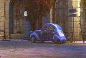 a noite é muito agitada e divertida. Um 2CV azul de 1967 é o