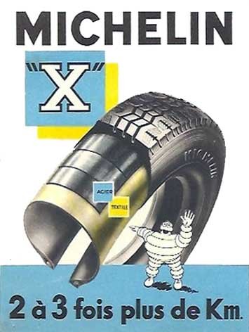 Michelin X, o primeiro pneu radial no mundo; embaixo a edição inicial de