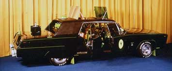 O Golden Sahara (em cima), um Lincoln 1953 que tinha até televisão, e o Plymouth Barracuda 1966 conversível feito para o filme Fireball 500