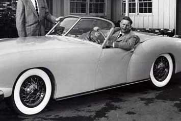 e ao volante do roadster Kaiser-Darrin de 1953 (no