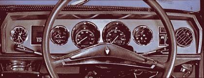 O painel de um R16 TS com volante à direita: diversos instrumentos e alavanca de câmbio na coluna de direção |