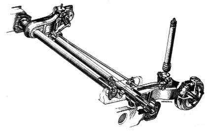| O interessante sistema de suspensão traseira independente, com barras de torção, resultava em distâncias entre eixos diferentes em cada lado |