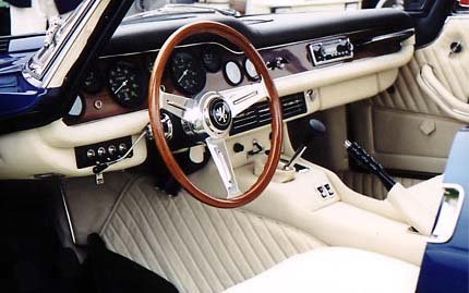 Visto de lado eram notáveis as duas entradas de ar. Uma ocupando boa parte do pára-lama dianteiro, perto da imensa porta; a outra, bem menor, atrás da caixa de roda traseira. Para um esportivo, a visibilidade para qualquer ângulo era muito boa. O vidro traseiro amplo e envolvente facilitava as manobras. Por dentro os oito mostradores do painel, da marca Veglia, vinham inseridos em madeira de alta qualidade. O volante de três raios metálicos tinha aro também de madeira e, nos bancos dianteiros espaçosos, forrações de portas e console central, o couro de ótimo padrão estava presente. Ar-condicionado era opcional. |