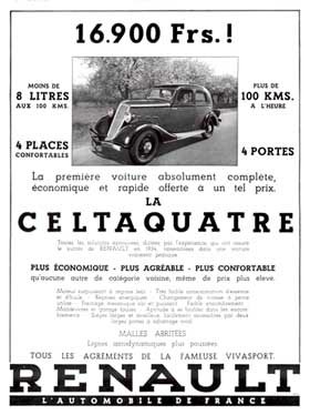 Foram ao todo 44 mil exemplares deste modelo de pouca duração, mas que colocou a Renault em um padrão de estilo menos convencional. Estava posicionado na linha entre o novo Juvaquatre, menor que o Celta, e o Novaquatre. O Celtaquatre não tinha mais lugar nas concessionárias em 1939. |