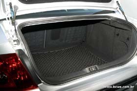 braço central com porta-objetos e porta-copos. O espaço de bagagem é