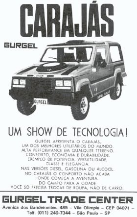 No ano anterior, a Gurgel lançava o jipe Carajás, outro nome indígena. As versões eram TL (teto de lona), TR (teto rígido) e MM (militar). Versões especiais ambulância e furgão também existiram. Um detalhe que chamava logo a atenção era o grande estepe sobre o alto capô dianteiro, solução inspirada nos Land Rovers que prejudicava a visibilidade frontal. Braços com músculos bem desenvolvidos eram indicados para abri-lo na hora de alguma manutenção. De frente era notável a grade preta com quatro faróis retangulares, iguais aos do