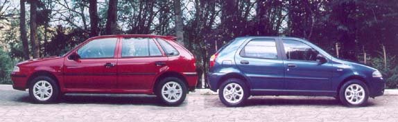 mais. O projeto básico do VW está no mercado desde 1980, mas a carroceria adotada há sete anos era totalmente nova. Da mesma forma, embora baseado no Uno de 1984 (Europa, 1983) e inclusive mantendo seu entreeixos, ao contrário do VW, o Fiat era um novo projeto, com suspensões e carroceria bem distintas. |