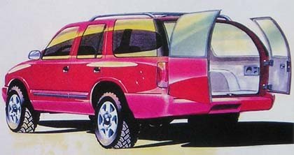 | Neste esboço do Blazer brasileiro, uma idéia não aprovada: duas portas para acesso à bagagem, com articulação vertical |