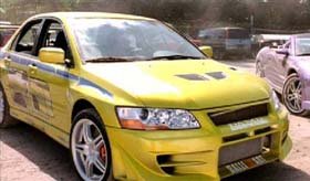 Gibson e Eva Mendes, um Lancer Evolution VII amarelo, todo