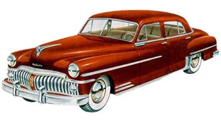 | Após o conflito, o DeSoto 1949 era o primeiro com novo estilo, que deixava os pára-lamas mais incorporados ao conjunto; ao lado o modelo 1950 |
