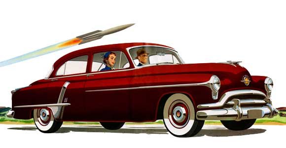Olds adotou em 1950 um foguete como logotipo do modelo, aplicado à tampa