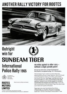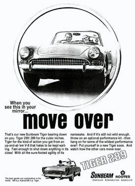 No final de 1964, a Chrysler comprava o grupo Rootes e o futuro do Tiger passava a ser incerto, por causa da mecânica Ford. Mesmo assim, em dezembro de 1966 o motor 260 era substituído pelo do Mustang 289, de 4,75 litros. O Sunbeam passava a ter 200 cv e velocidade final de 200 km/h. Seis meses depois, porém, a produção era interrompida. Foram fabricados 7.100. Provavelmente a Chrysler não se interessou em montar nele um V8 Dodge ou Plymouth. |