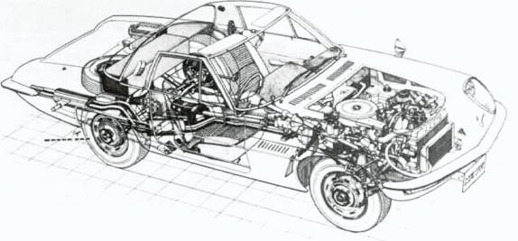 eixo De Dion, usando molas semi-elíticas (as dianteiras eram helicoidais em um sistema de braços sobrepostos). Mas o destaque estava sob o capô: o motor L10A, birrotor, com carburação Zenith de quatro corpos, duas velas por rotor e cilindrada total de 982 cm3, equivalentes a 2.000 cm3 em um motor convencional. A potência prova isso: 110 cv líquidos a 7.000 rpm, origem da denominação 110S em alguns mercados de exportação. O torque máximo era de 13,3 m.kgf a 3.500 rpm. |