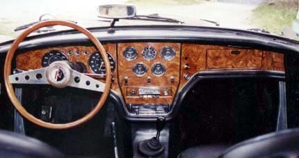 O interior do modelo Facel III: painel e aro do volante de madeira, muitos instrumentos e o retrovisor interno logo acima, como em outros conversíveis da época |