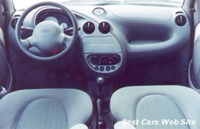 | Formas inusitadas também no painel, com o charmoso relógio oval no centro. Poderiam existir conta-giros, marcador de temperatura e um porta-luvas de verdade | ![]() |